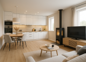 1. nadzemné podlažie (1 NP): vstupná hala, obývačka s kuchyňou, izba, veľká kúpeľňa, samostatné WC