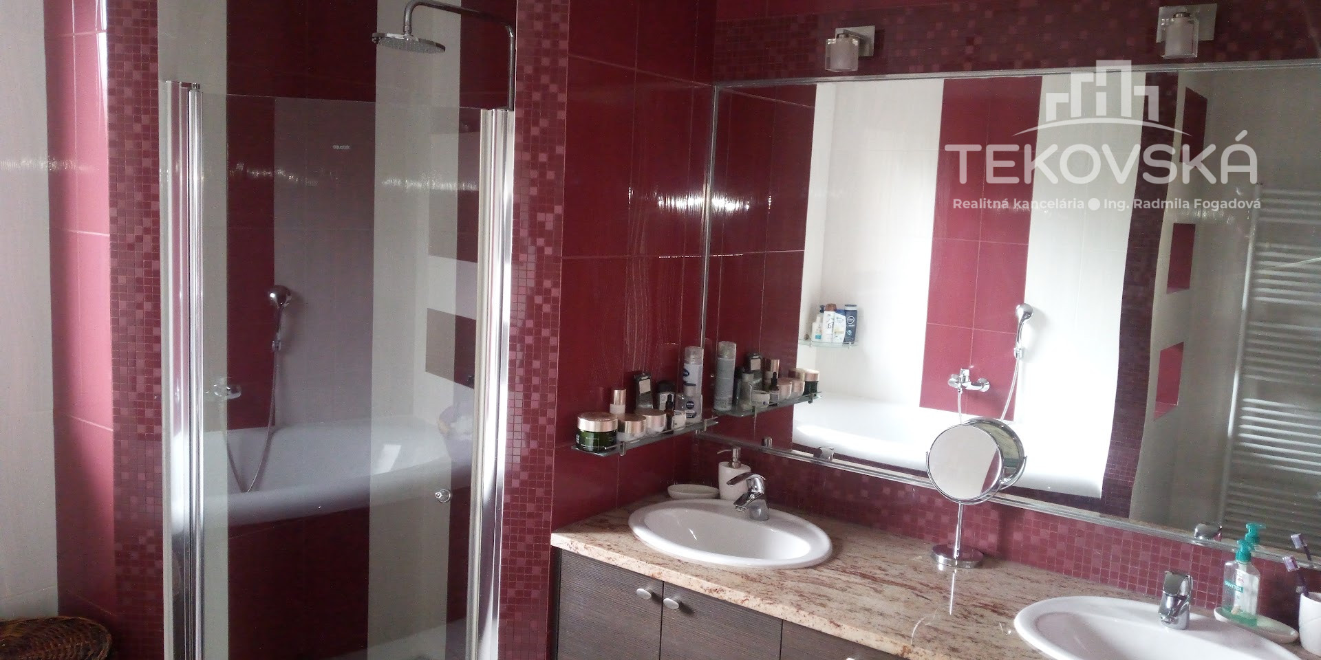 Kúpelňa je riešená s ohľadom na viacčlennú rodinu - 2 umývadlá, sprcha, vaňa, WC.
